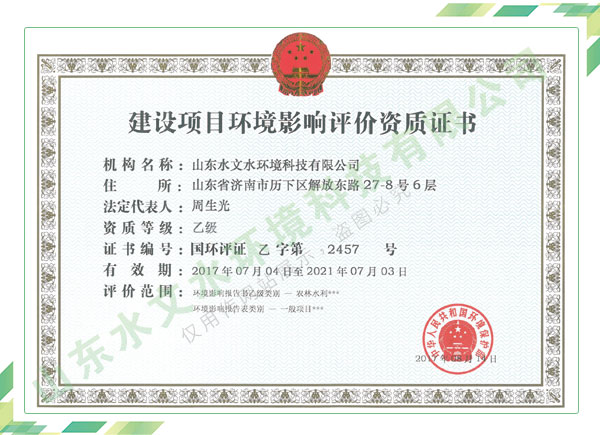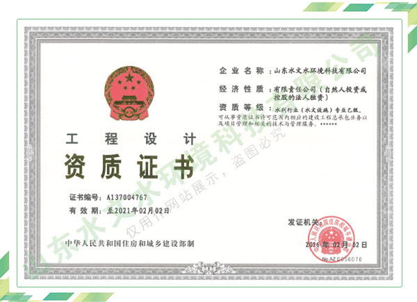 公司擁有水利工程設計、水土保持、水文水資源調查評價、水資源論證、建設項目環(huán)境影響評價、市政公用工程施工總承包、水利水電工程施工總承包、電子與智能化工程專業(yè)承包等資質,2017年通過質量管理體系、環(huán)境管理體系、職業(yè)健康安全管理體系認證;2020年被評為國家級高新技術企業(yè),同年被中國水利企業(yè)協(xié)會推薦為第一批“合同節(jié)水服務企業(yè)”;2021年被山東省、濟南市評為 “專精特新”中小企業(yè)。業(yè)務范圍涉及水利工程設計;節(jié)水設計、改造、水平衡測試;山洪災害調查;城市水資源調查評價;建設項目水土保持方案編制、監(jiān)測、驗收、水土保持規(guī)劃;水安全保障規(guī)劃、建設項目水資源論證、規(guī)劃水資源論證;建設項目環(huán)境影響評價;入河排污口論證;防洪影響評價;市政公用工程施工、水利水電工程施工、電子與智能化工程施工等。